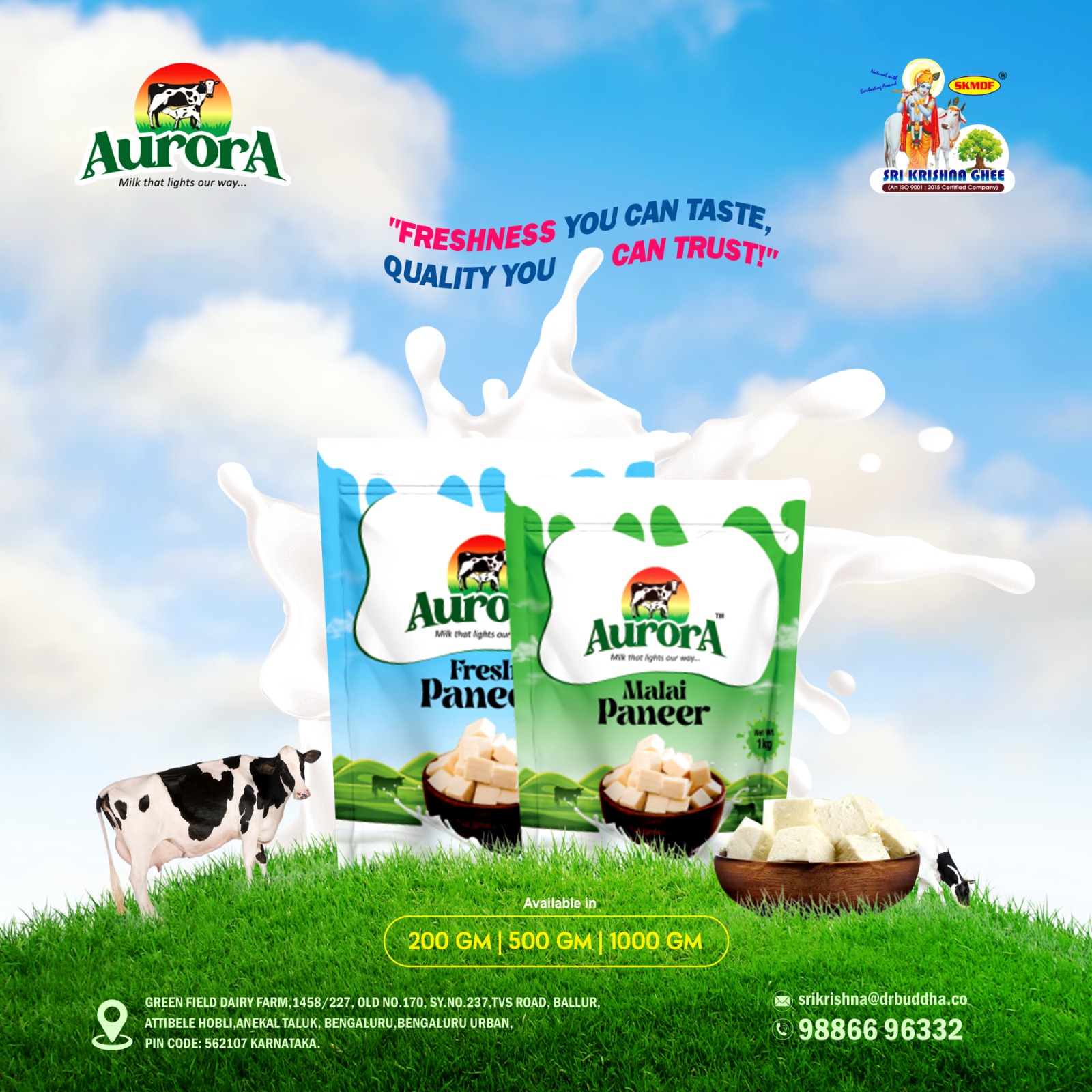 Aurora Dairy Products offers premium dairy like milk, curd, paneer, and ghee, made from pure cow milk free of hormones and antibiotics. We ensure top quality, nutrition, and sustainable farming. Experience wholesome goodness with Aurora, where tradition meets innovation. Savor the finest flavors!